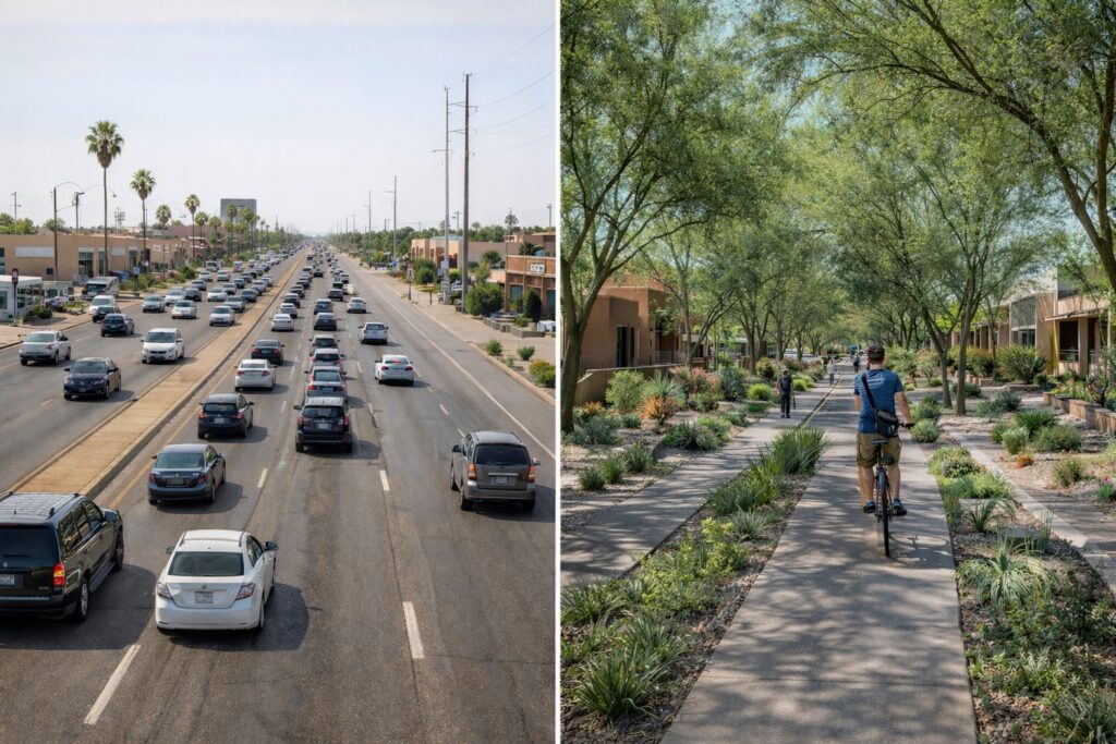 Local plans (Move Tucson, RTA 2045, Pima County) share emerging themes: prioritize safety, equity, and multimodal options; design from the sidewalk inward; and recognize that widening roads cannot solve congestion. All seem to agree that ultimately our financial constraints and the urgency of carbon drawdown require a shift from auto-dependence to greener forms of mobility.